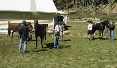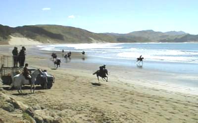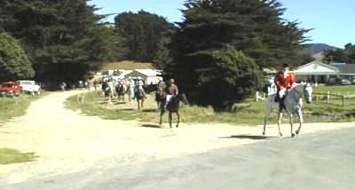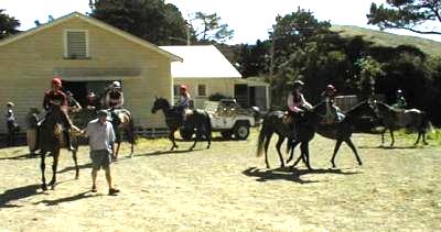 | Jockeys waiting to go to the beach by the old Castlepoint Station woolshed | ![]() |